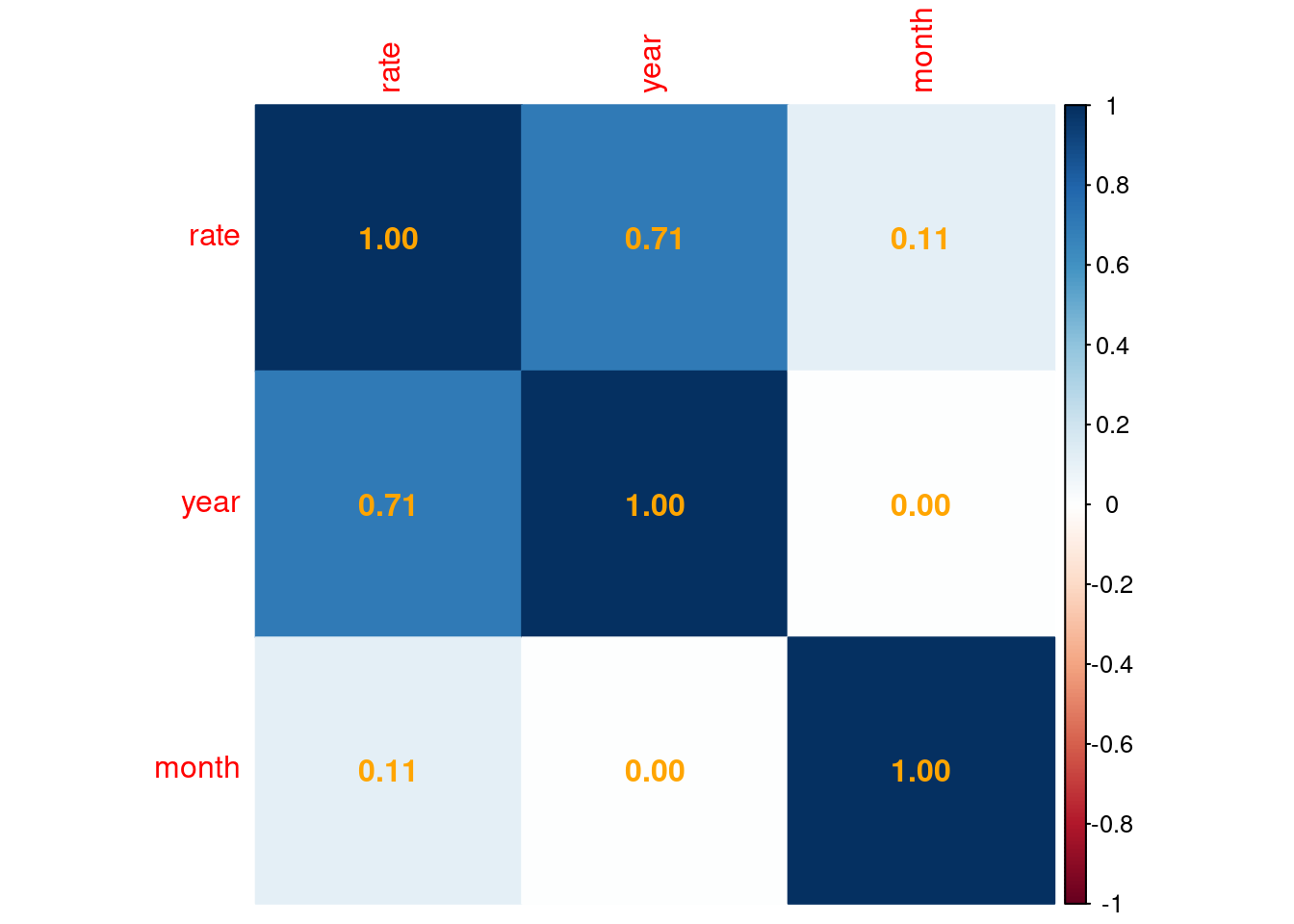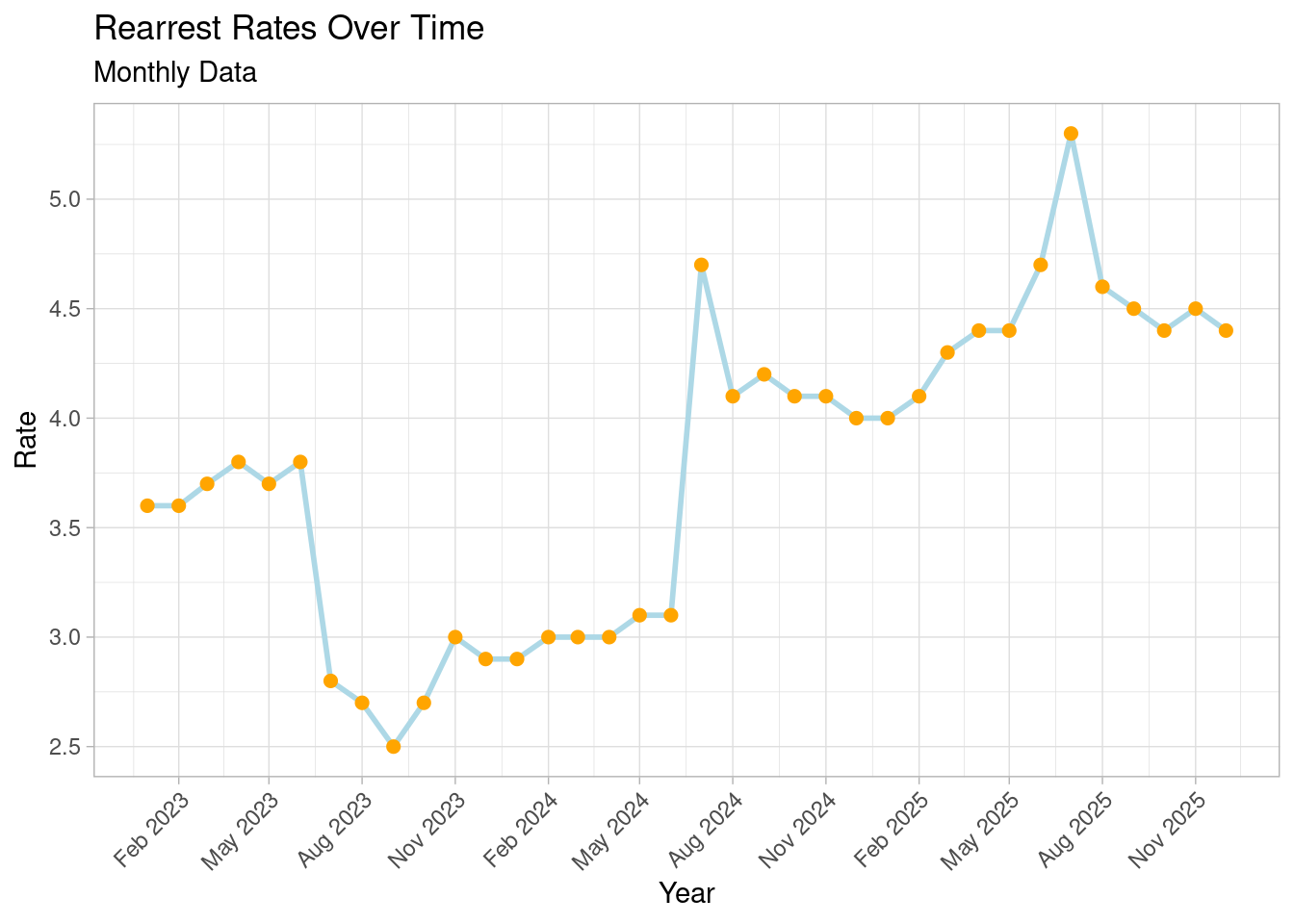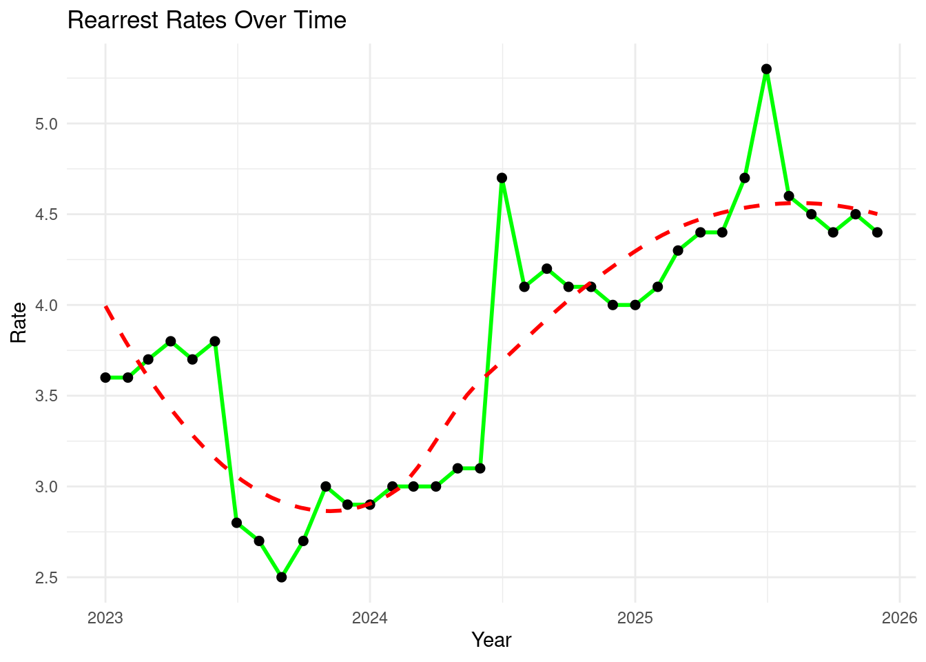 6.9 Let’s finally see if we can find a correlation between rearrest rates and year